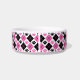 Este lindo plato mascota muestra un patrón de huellas de argyle rosa y negro y un espacio para agregar el nombre de tu mascota.