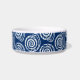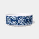 tazón de mascota en forma de impresión en bloque, basado en una concha espiral, de color blanco sobre fondo cobalto azul
