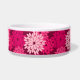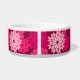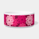 Un bol mascota en una versión moderna de una tradicional huella de kimono floral japonesa - flores estilizadas en tonos claros a rosa de coral profundo y fucsia en un fondo burdeos/marrón profundo