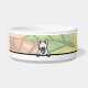 lindo Bull Terrier curioso tazón de comida o agua.