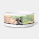 Tazón de comida o agua para bulldog inglés lindo asomándose.