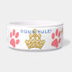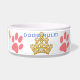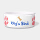 Sabemos quién gobierna la casa - Este gran tazón de perro presenta un ilustracion original de ZoeSPEAK de una corona dorada hecha de huesos de perro y huellas de pata. También hay cuatro huellas de perros rosados alrededor del bol blanco, y las palabras "¡EL PERRO REGLA!" en azul. Entre dos de las huellas de la pata hay un texto en azul que dice "Bola del Rey". Esto se personaliza con el nombre de tu perro o cualquier otra cosa que quieras.