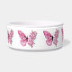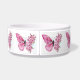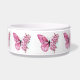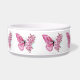 Arreglo floral de mariposa rosa con flores japonesas de cerezo rosadas sobre fondo blanco.