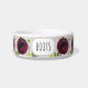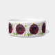 Tazón de comida para mascotas de cerámica para su gato o perro que presenta la imagen fotográfica de una flor de Dalia de color rojo oscuro impresa en un patrón repetido junto con el nombre de la mascota. Personalice el tazón de la mascota reemplazando el nombre de la mascota con el suyo. Un diseño floral encantador! Seleccione el tamaño de su tazón para mascotas.