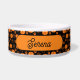 Este tazón de perro personalizado presenta un lindo patrón de calabazas dispersas y patas con calabazas naranjas y garras sobre un fondo negro. Perfecto para Halloween y toda la temporada de espeluznante otoño. Añada un toque de otoño a la comida de su mascota con este cuenco de perro monograma. Personalizado con el nombre de su perro en escritura negra en un fondo naranja de coordinación. ¡Felices Amantes!