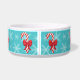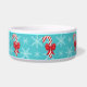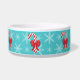 Ilustracion festivo y adorable de personalizados rojos y blancos de Navidades de caramelos con hermosos arcos rojos. El color de fondo es azul con un patrón de copo de nieve claro. También hay un área de texto de personalizable para el nombre del mascota.