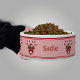 El ilustracion original de Destei de dos Navidades de rayas rojas y blancas dulces de caña de caramelo decorados con un arco rojo y una planta de Navidades holly / Common Holly. El diseño se coloca unas cuantas veces alrededor del bol. También hay un área de texto personalizable para un nombre u otro texto personalizado. El diseño está enmarcado por un borde de color rojo en la parte superior e inferior y el color de fondo es rosa. Este diseño festivo con colores clásicos de Navidades rojos y verdes es ideal para la temporada navideña cuando se decora con la paleta de colores tradicional. El diseño también funciona para mascotas llamados "Candy cane" o "Peppermint", por ejemplo.