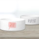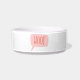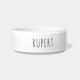 Este lindo y gracioso tazón de perro mascota personalizado presenta la palabra con letras a mano "WOOF" dentro de una burbuja de charla y al otro lado el nombre de su mascota personalizado en un clásico texto en serif con letras a mano todo-mayúsculas. Un estiloso tazón de agua y de comida para tu peluche familiar, también disponible en grandes dimensiones. ©Marisu Valencia