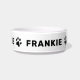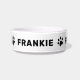 Este singular tazón de perro o gato mascota personalizado cuenta con su nombre en un estilo moderno todo-caps con adorables acentos de huella de pata alrededor del bol. Un diseño simple y limpio para tu peludo familiar. Nota: el color de las impresiones de texto negro y de la pata negra se puede modificar.