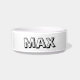 Cute nombre personalizado blanco y negro divertido perro de texto juguetón mascota comida o cerámica de agua Bowl. Personalizable de texto negro, fondo blanco