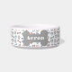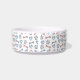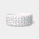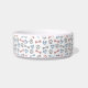 Un divertido y genial diseño personalizado de un tazón de perro con huesos de perro, patas y corazones en azul, rosa y gris. Diseñado por Thisisnotme©