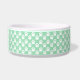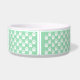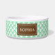 Este tazón para mascotas presenta un patrón de huellas de patas de perro blancas sobre un fondo de color verde menta. También hay una banda marrón con un área de texto personalizable para el nombre de tu mascota. El color beige se puede cambiar a cualquier otro color bajo personalización.