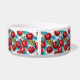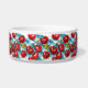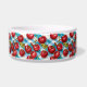 Un patrón acuático de ilustracion ai de cerezas rojas brillantes, follaje verde salado y tazón mascota a cuadros azules.