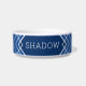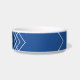 Diseño de tazón mascota único en azul marino, blanco y azul real con líneas geométricas y cuadrados superpuestos con el nombre de un gato o perro impreso en medio de la parte delantera de un alimento cerámico blanco o tazón de agua. CONSEJO DE DISEÑADOR: Todos los colores y fuentes son editables para que puedas diseñar tu propio tazón creativo como una obra de arte que coincida con tu decoración.
