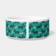 Un tazón mascota con un nombre personalizado y diseñado con un patrón repetido que presenta un doggy sonriente lindo con orejas disquetas y un hueso de perro. Fondo verde.