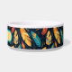 Tazón para mascotas brillante y colorido al estilo nativo americano del suroeste con plumas turquesa, naranja, amarillo y óxido sobre fondo negro. En el centro hay una pancarta de color melocotón donde puedes personalizar el nombre de tu perro.
