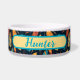Tazón para mascotas brillante y colorido al estilo del suroeste y nativo americano con plumas turquesa, naranja, amarillo y óxido sobre fondo negro. En el centro hay una pancarta de color melocotón donde puedes personalizar el nombre de tu perro.