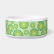 Un patrón divertido de rodajas de fruta de cal verde en diferentes tamaños junto con un área de texto personalizable para un nombre u otro texto personalizado como "comida" o "agua". La parte superior e inferior tienen un borde verde, mientras que el color de fondo es verde claro, lo que crea una base agradable para que se muestren las lonchas de cal. Este es un diseño lindo para un mascota llamado "Lime" o para cualquiera que esté buscando añadir un toque de verde a su espacio.