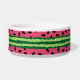 Un tazón mascota personalizado con un lindo patrón de sandía. Corteza verde en capas de rayas junto con una capa de rayas rosas con semillas negras dentro. Diseño divertido y veraniego. Un marco de rectángulo blanco sobre la parte superior con el texto dentro.