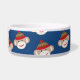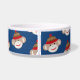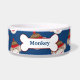 Este tazón de mascota de personalizable de calcetín de mono tiene un fondo azul y muchos monos de calcetín. El hueso de perro en el centro tiene un nombre de ejemplo, "Mono", pero se puede cambiar a cualquier nombre.