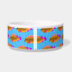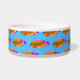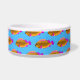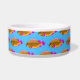 Este divertido tazón para perros presenta brillantes peces tropicales naranja y rosa sobre un fondo de arte lineal y un hermoso azul océano.