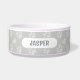 Pawsome Paw Imprime el mascota del patrón corazón o el tazón del gato en tonos grises con un nombre de etiqueta, para el compañero de peluche más lindo. Seleccione el tamaño y personalice fácilmente el texto. - Kate Eden Art