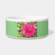 Un bol de mascotas con una foto de una rosa rosa rosada en su suelo verde.