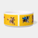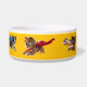 A dog bowl feauring seven superhero dogs in flight. The superhero dogs are Border Collie, Chow Chow, Dachshund, Golden Retriever, Beagle, Bulldag, and Airedale Terrier.