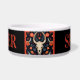 Este tazón para mascotas al estilo del sudoeste nativo americano es perfecto para perros más grandes. Cuenta con un cráneo de toro y cuernos en el centro y un fondo floral realizado en tonos de naranja y botánicos gris azulados. Todo está hecho sobre un fondo negro y luego se personaliza con el nombre del perro en un color naranja coordinado.