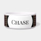 El tazón de comida de perro hecho de cerámica blanca tiene un interesante patrón negro como fondo para el nombre de sus perros. HAMbyWhiteGlove.