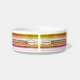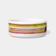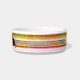 El tazón de comida de gato de cerámica blanca tiene dos gráficos de gatos a cada lado del portaobjetos de color negro. El fondo tiene un aspecto anticuado de franja de gradiente. A cada lado hay una banda de colores que tiene un diseño cruzado. Un aspecto muy fresco en un tazón de gato personalizado. Diseñado por HAMbyWhiteGlove.