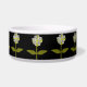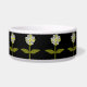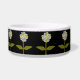 Este impresionante tazón mascota presenta una imagen digital de una margarita con un tallo verde con dos hojas verdes sobre ella y pétalos de color blanco y amarillo con un centro amarillo. Los pétalos parecen brillar con una hermosa calidad reflexiva. La flor está sobre un fondo negro para un contraste máximo y el resultado es impresionante.