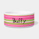 Un plato de perro de gran aspecto hecho en cerámica blanca y gráficos de rayas rosas y verdes, alrededor del bol. El texto personalizado negro, en el medio, está listo para personalizar para tu pooch. Gran idea de regalo para cualquiera con un mascota, viene en dos tamaños.