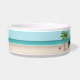 El original ilustracion personalizado de Destei de un lindo perro de raza Boston Terrier color abrigo negro y blanco parado en una playa tropical de verano. En la arena de color beige hay una palmera, una concha rosa, una estrella de mar y un cangrejo rojo. El agua es azul turquesa con algunas olas y el sol brilla por encima del horizonte. También hay un área de texto personalizable para un nombre u otro texto personalizado como "comida" o "agua".