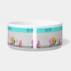 Usted está invitado al evento social del año con este diseño de tazón mascota cerámico Fiesta de la Palm Springs Stewardess. Únete a estas tres veteranas aeromozas de las aerolíneas rivales mientras se registran en su kitschy hotel en bloques de brisa de los años 60. Uno de los fabulosos y coloridos botones con un retro uniforme rosado caliente sostiene la puerta del naranja mientras que el otro lucha con el equipaje de las mujeres. Las palmeras verde azuladas se desprenden de un cielo increíblemente turquesa mientras un barco transbordador vuela por encima. Este diseño te hará decir: "¡En tu marca, jet set, ve!"