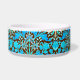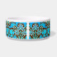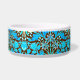 tazón mascota en un patrón vintage de William Morris de jacintos, tulipanes y hojas, en tonos de agua suave y azul ceruleño, acentuado con rosa de coral y naranja, sobre un fondo marrón chocolate oscuro