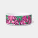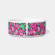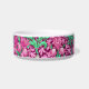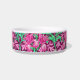 tazón Mascota en un William Morris, Art Nouveau, letra textil de iris y hojas, realzada digitalmente y coloreada, en fuchsia y rosa hielo, verde pavo y blanco, sobre un fondo violeta de vino profundo