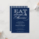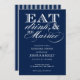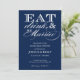 Esta elegante invitación a la cena para ensayar incluye la frase "Comer, beber y estar casado" en una tipografía audaz.