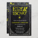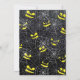 Coma, bebe y asusta Invitación a la boda de Halloween con un cráneo y un borde web sobre un fondo negro. Comer, beber y dar miedo está decorado con un murciélago, cuerdas, telaraña y araña colgante. Sus nombres y "Come, Bebe y Da miedo" están en una fuente amarillo brillante mientras que el resto del texto es blanco. La parte de atrás de la invitación tiene rostros amarillos de jack o'lantern y un overlay de telaraña.