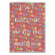 Cómete beber y sé feliz saludo de Navidad con letras blancas con decoración de árbol de Navidad en azul, verde, amarillo, morado y rosa con un fondo rojo.