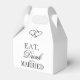 Come bebida y sé casada cite la caja de favores de la boda. La fiesta de bodas de Cute DIY favorece la idea de regalo para los huéspedes. Cajas en forma de cuchara para trinquetas o dulces caseros. Diseño de plantilla de moda con tipografía de escritura elegante más dos corazones entrelazados dobles. Mensaje de agradecimiento personalizado con nombres o monogramas de novia y novio más fecha de matrimonio. Elegante material fiesta y elegantes accesorios para agradecer la llegada. Diversión para bodas alegres. También es agradable regalar regalo para ducha de novia, damas de honor, barbacoa de parejas de patio trasero, compromiso o aniversario. Cambiar la cantidad para obtener el precio al por mayor. Parte de diseño en blanco y negro del conjunto de colección elegante. Fondo de color de personalizable.