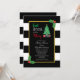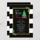 Coma, bebe y sé feliz invitación a la ducha de bebé navideña con un árbol de Navidad y regalos contra un marco dorado. Fondo rayado blanco y negro con fondo hueco