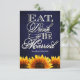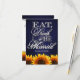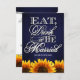 Cómete las tarjetas RSVP de Bebida y cásate de boda rústica - concuerdan con las invitaciones y más abajo en esta página. Compliquen el tema de su boda de girasol con estas tarjetas rsvp que incluyen una pizarra azul como fondo con "Comer, beber y estar casados" en un guión divertido y elegante con girasoles vibrantes en la parte inferior de la parte delantera y trasera de cada tarjeta. Estas tarjetas RSVP nupales de boda se establecen como material de tarjeta básico de alta calidad; sin embargo, pueden cambiar el stock a lino, fieltro (grabado en relieve), reciclado y varios metales. sombras si desea bajo el número 2 (elija su estilo, tamaño y tipo de papel) debajo del botón naranja añadir al carrito. También se muestra en esta opción una lista de los costes adicionales de un stock de tarjeta más avanzado. Cada tarjeta RSVP incluye un sobre blanco. Consejos para personalizar las tarjetas RSVP de tu boda Este estilo permite una recepción tipo bufé. Si necesita una cena RSVP de 2 o 3 plazas, desplácese hasta encontrar los productos disponibles. Haga clic en el botón naranja del personalizar debajo de la demostración de tarjeta RSVP de boda para cambiar el tipo de letra, color o tamaño de texto a lo que prefiera. Si está satisfecho con el estilo de fuente, el color del texto y los tamaños, puede utilizar la característica de personalización a la derecha de la demostración para cambiar la información de demostración a los detalles personales de su boda. Sólo asegúrese de ver la demo después de cambiar los detalles (la demo cambiará automáticamente después de haber realizado cambios en el texto, el tamaño o los colores del tipo de letra). La demostración le dará una prueba de su invitación después de realizar los cambios. Haga clic en el botón de la lupa encima de la demostración de RSVP para obtener una prueba de vista completa. También puede hacer clic en cada imagen (frontal y posterior) para desproteger cada lado después de realizar los cambios. Otro consejo es hacer clic sobre el botón de diseño que hay encima de la demostración para ampliar el alcance para ver más detalles y obtener una mejor previsualización de los colores y la decoración del diseño. Asegúrese de comprobar cada lado de la tarjeta antes de añadir a su carrito para su salida siguiendo los consejos anteriores.