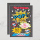 Comic Book Superhero Baby Shower Invitaciones en un fondo de tiza ¡Está a punto de POP! Celebra el nacimiento del recién nacido con una divertida y colorida invitación a la ducha de bebé inspirada en un libro de historietas. Ilustracion dibujado a mano por McBooboo