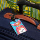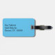 Colorida etiqueta de equipaje divertido, con gráficos personalizados de un gato cómico rosa, blanco y naranja, contra un fondo azul cielo decorando la parte delantera de la etiqueta. La parte posterior de la etiqueta está hecha en azul cielo, con texto negro personalizado. Personalice todo el texto para leer lo que desee.