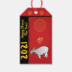 Ilustracion de búfalo de agua al estilo de las historietas colocado en el patrón tradicional chino rojo como fondo + año dorado del x en el centro con banda negra vertical para letras modernas amarillas : Feliz Año Nuevo Chino y gran 2021 a personalizar si quieres. Diseño en etiqueta de regalo. Puede cambiar fácilmente estos textos (fuente, color, tamaño y posición) haciendo clic en el botón personalizar. Tarjeta de felicitación coincidente, postal de vacaciones, invitación, artículos de artesanía, suministros de fiesta y más... Perfecto para un divertido Año Nuevo Chino del Ox 2021 o Cumpleaños (personas nacidas en el año Ox).
