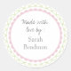 Aquí hay algunos lindos pegatinas de moda rosa y verde que puedes usar en tus propios artículos hechos a mano. ¿Ya sean recetas cocinadas en casa, dulces, pasteles, mermeladas, ungüentos, mermeladas, conservas, o quizás para tu ropa de coser a mano o proyectos artesanales? Asegúrate de que todos sepan que lo lograste con tus propias manos... la gente ama las cosas hechas a mano porque hay mucho más amor en ellas!! Así que para personalizar a estos pegatinas... puedes escribir el nombre que quieras imprimir o quitar el nombre y dejarlo en blanco para que puedas escribir tu nombre a mano en los pegatinas para agregar un toque personal hecho a mano!!. Otros colores y estilos disponibles en mi tienda de zazzle. ...