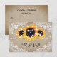 Rústicas tarjetas RSVP de boda de girasol vintage con opciones de comida. Artículos a juego disponibles para complementar estas rústicas tarjetas RSVP de bodas de moda con girasoles en un fondo de arpillera perturbado adornado con encajes florales blancos y luces de cuerdas.