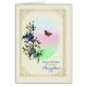 Una hermosa tarjeta de cumpleaños floral para alguien que es como una hija para ti. Un bonito ramo de flores azules y blancas con una mariposa marrón en vuelo. El cuadro tiene un delicado marco dorado.