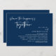 Moderno diseño de tarjeta de invitación de boda con tema de escritura en azul marino (Comparte la felicidad juntos). Es perfecto para tu recepción de boda / fiesta de celebración después de la boda. Agrega tus detalles en fuente / letra coincidente.